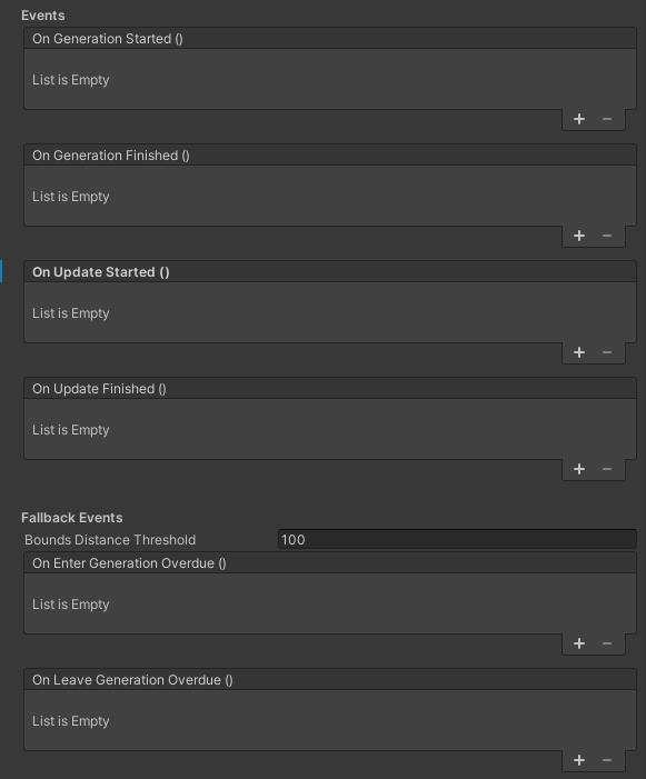 | OnEnterGenerationOverdue | The event which is invoked when the GenerationOrigin, i.e. the Player, got too close to the latest finished generation context's InnerBounds, based on the given BoundsDistanceThreshold. |