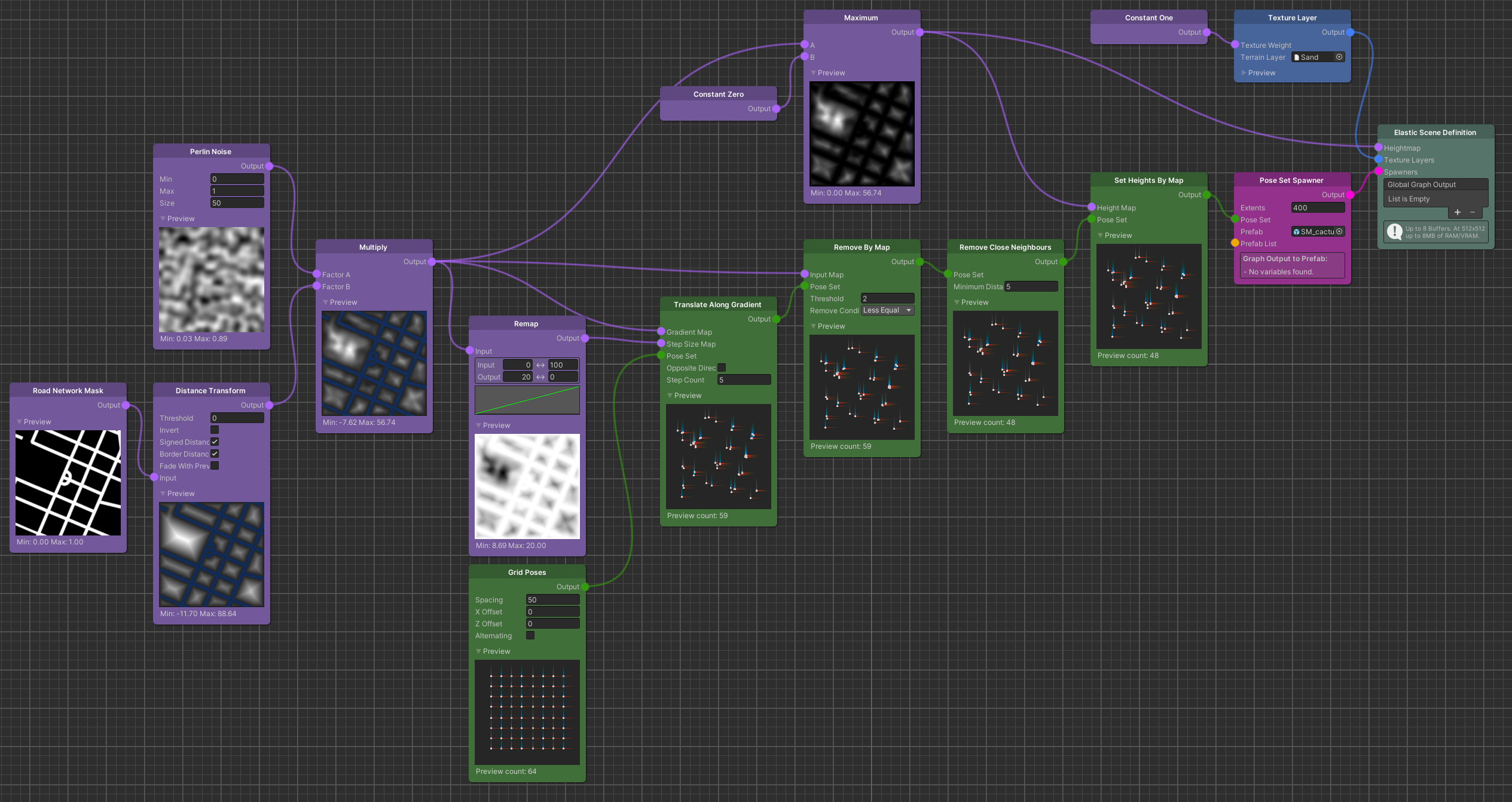 Finally this generates the output that we use as the Pose Set for the the Pose Set Spawner, to instantiate cacti only around hilltop areas.