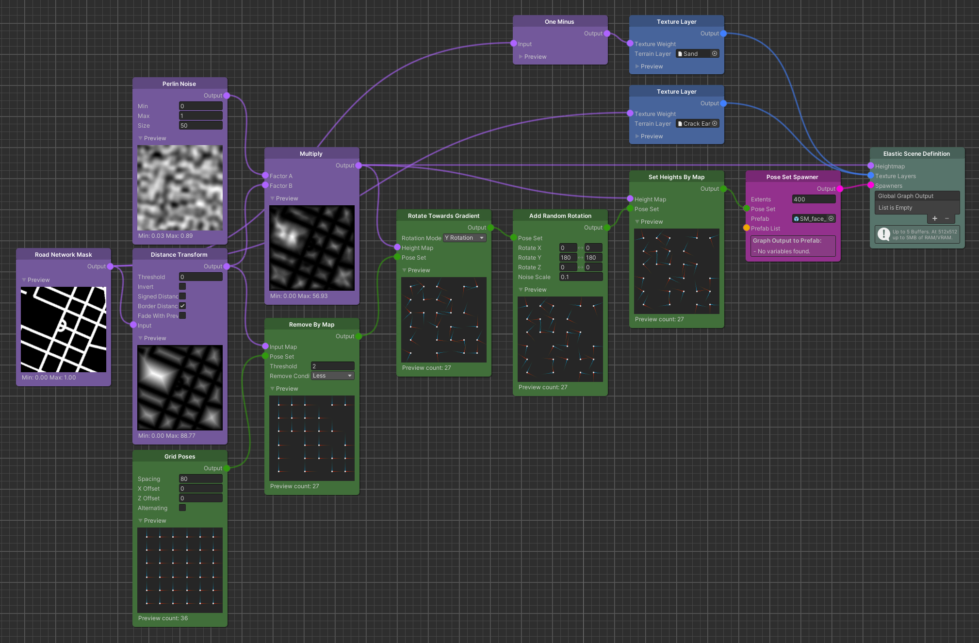 For the gradient, we take a Distance Transform of the Road Network Mask. Then we multiply with a Perlin Noise to