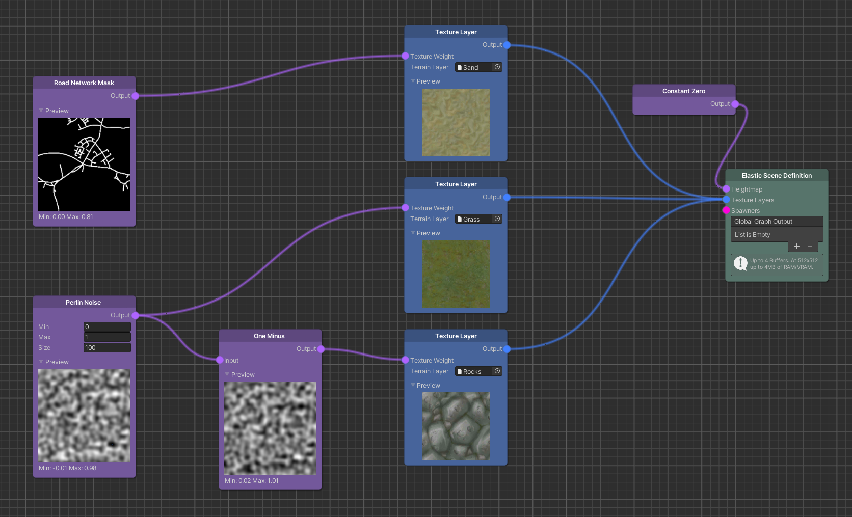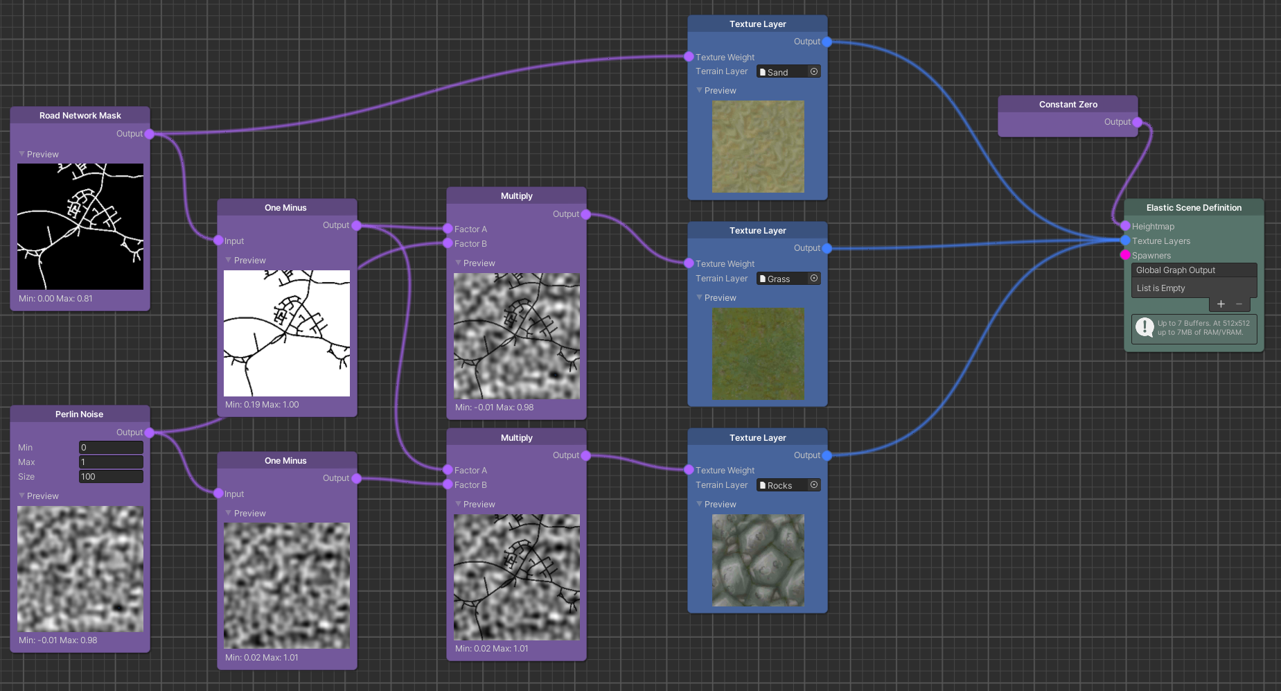 Let us add two simple Map Sources, a Perlin Noise and a Road Network Mask node and connect them to two of our Texture Layers. Texture Layers are more predictive if the map values are kept between 0 and 1. Therefore, we set the max value of the Perlin Noise node to 1. We add a One Minus node with the Perlin Noise node as input and connect its output to the third Texture Layer.