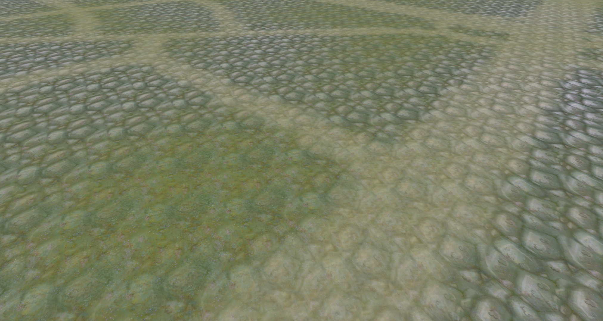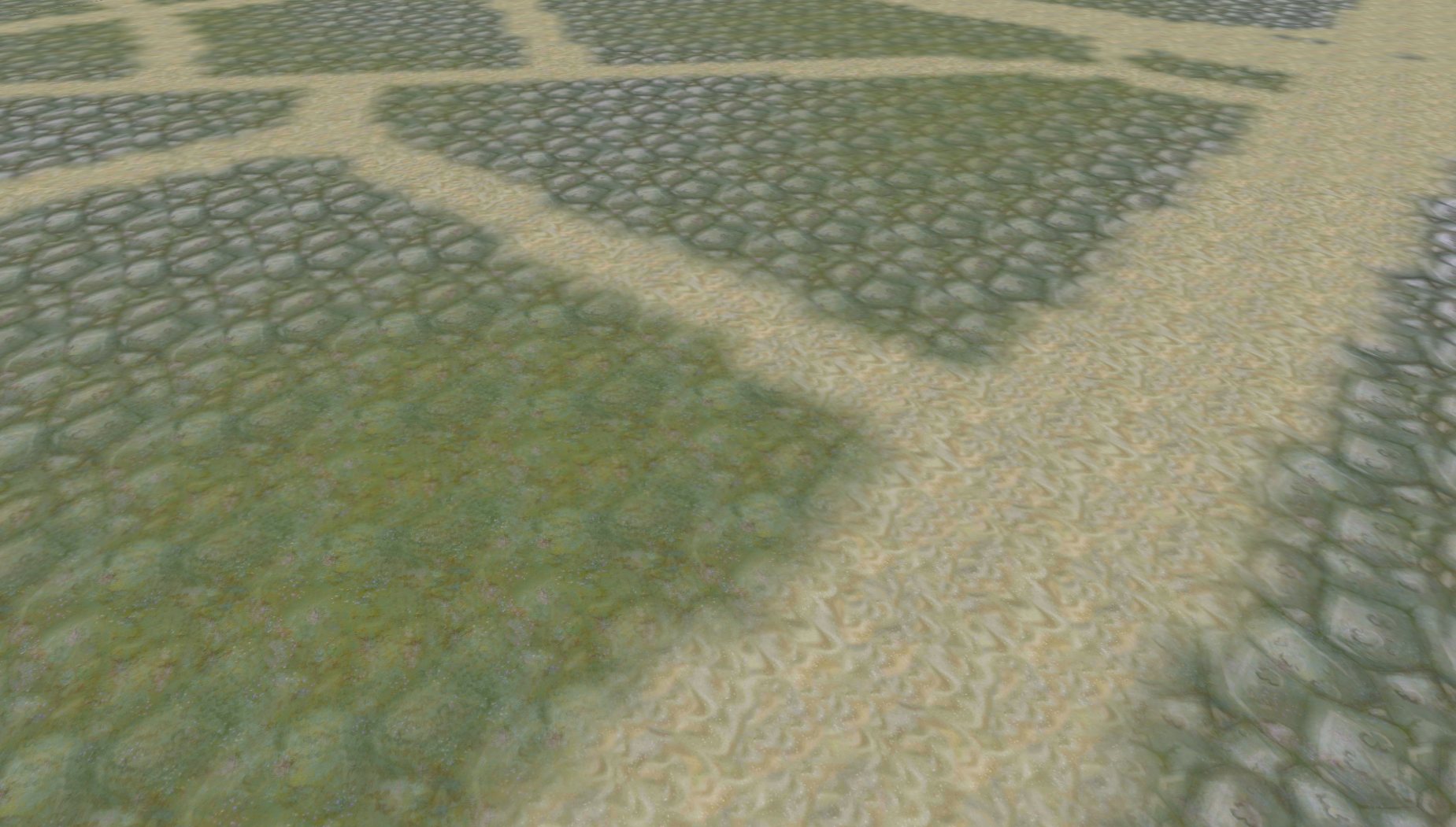 As the terrain is generated, you will notice how the Perlin Noise blends between two alternating textures. The One Minus node ensures that the sum of both masks is 1 at every position, which, as a rule-of-thumb, is the ideal state for predictive texture blending. At places where the noise map is close to the defined min and max values, only one texture is visible. That is, because here one masks measures up to 1 while the other approximates 0.