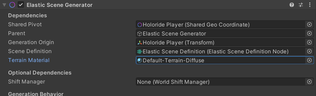 - The Elastic Scene Generator requires a reference to a material that supports Unity's Terrain Layer system.