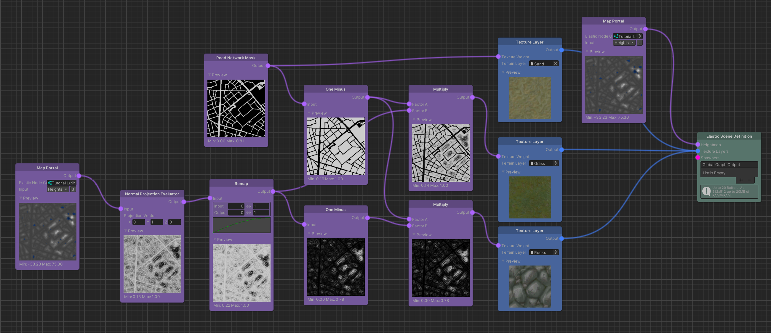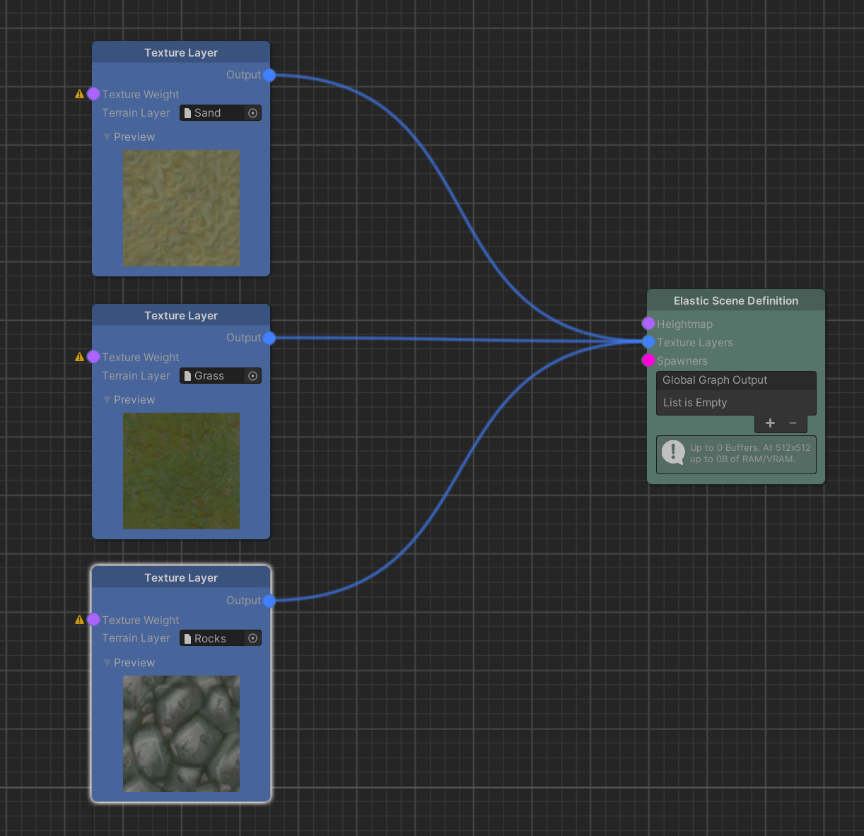 - In the Elastic Graph, Texture Layer nodes need to be added, linked to a Terrain Layer asset and connected to the Elastic Scene Definition node.