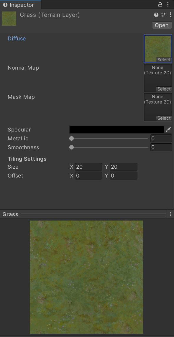 Further Terrain Layer settings are described in the official documentation. Mind that setting a Normal Map and Mask Map might be costly on mobile VR headsets. For the sake of tuning the Terrain Layer properties, we recommend you to temporarily add a Unity terrain to the scene, add the Texture Layers and paint a sample terrain.